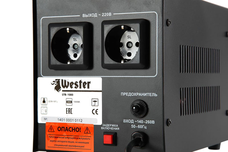 WESTER STB-1000 – однофазный стабилизатор напряжения, защищает подключённое оборудование от коротких замыканий и перепадов напряжения. Полная мощность – 1000 ВА. Подходит для стабилизации электропитания любых однофазных приборов суммарной мощностью до 800 Вт – на стабилизацию необходим резерв не меньше 20% от полной мощности.