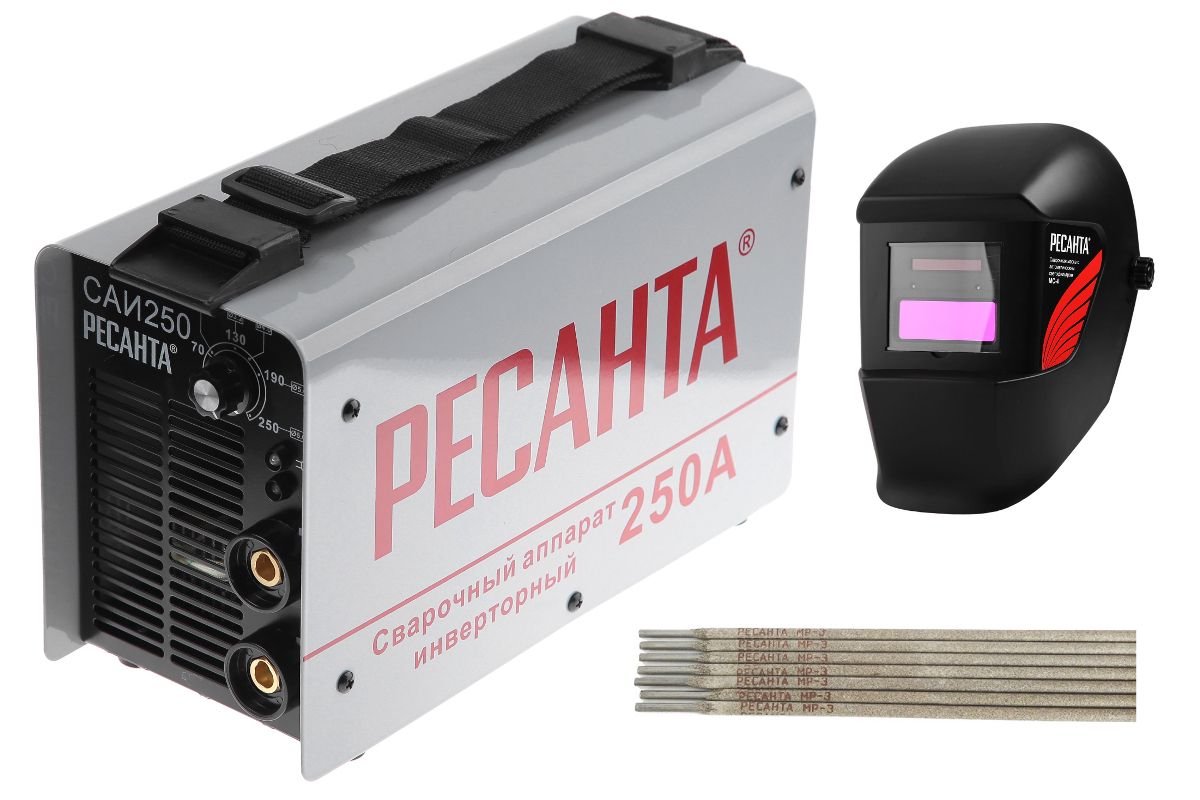 В состав набора входят: Инвертор сварочный РЕСАНТА САИ 250 140-240В 10-250А 1,0-6,0мм, Сварочная маска РЕСАНТА МС-4 авт. светофильтр DIN 11, Электроды для сварки РЕСАНТА МР-3 Ф3,0 1кг для ручной дуговой сварки