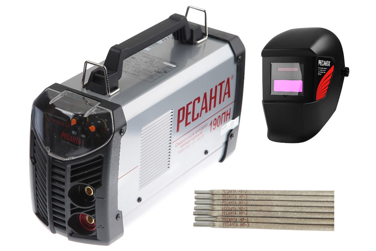 В состав набора входят: Инвертор сварочный САИ 190 ПН 140-240В 10-190А 1,0-5,0мм, Сварочная маска РЕСАНТА МС-4 авт. светофильтр DIN 11, Электроды для сварки РЕСАНТА МР-3 Ф3,0 1кг для ручной дуговой сварки
