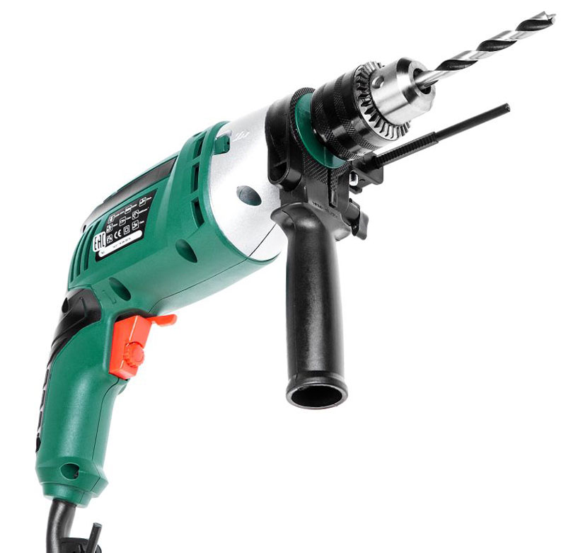 - Ключевой патрон диаметром 13 мм. Оснастка прочно фиксируется и не проворачивается в твёрдом бетоне.