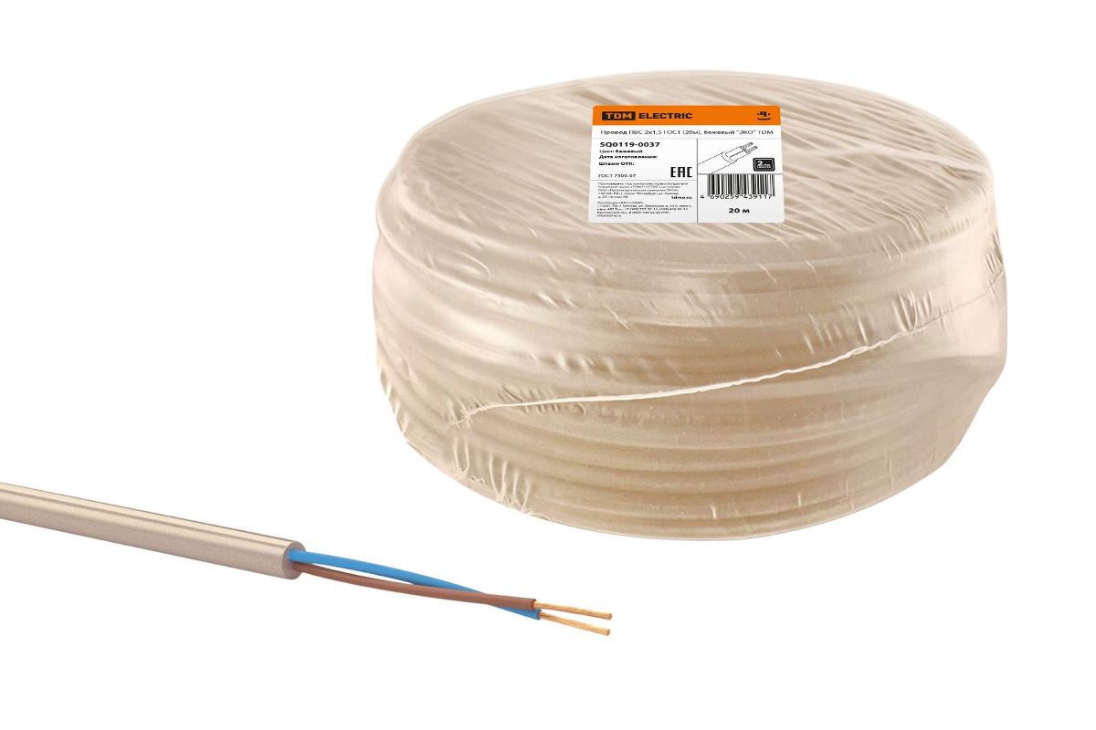 Провод TDM ПВС 2х1,5 ГОСТ (20м), бежевый ЭКО (цена за метр) SQ0119-0037